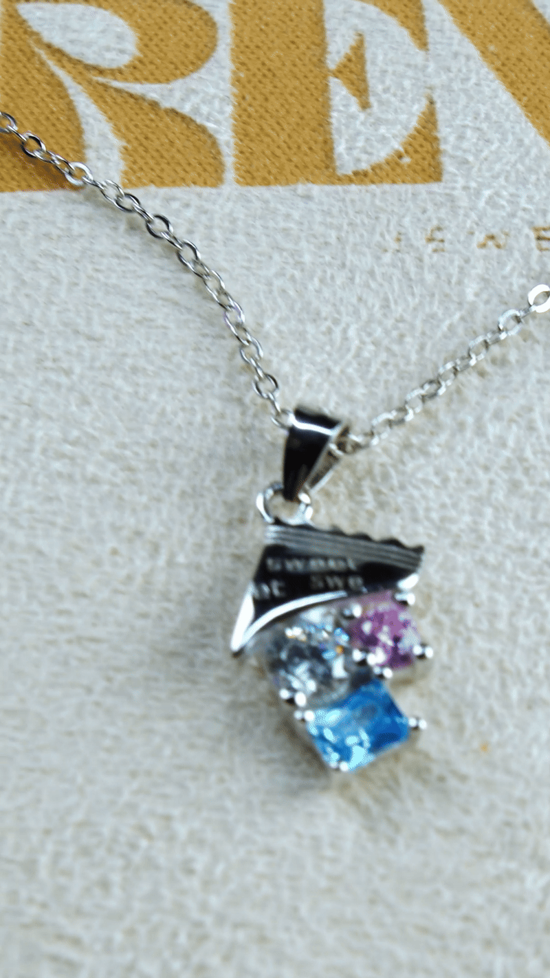 Crafted in solid 925 sterling silver, this playful pendant captures the joy of a sweet treat with a surprising twist: three dazzling crystals in pastel hues, sky blue, blush pink, and clear brilliance, nestled under a sculpted silver wrapper engraved with sweet.